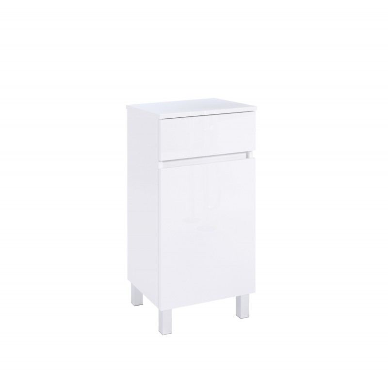 Móvel auxiliar de casa de banho, de chão, composto por uma porta, uma prateleira fixa, uma gaveta Folding (Max.10kg) e pés acetinados, de alumínio. Móvel produzido em superPan de 16 mm com acabamento em laminado ou lacado. O superPan é um painel constituído por aglomerado de partículas de madeira aglutinadas com resinas (UF), sendo as faces em MDF, conferindo ao painel uma melhor performance mecânica e excelente qualidade da superfície. O material utilizado cumpre com os requisitos da Classe E1 (analizado segundo EN ISO 12460-5) definidos na Norma Europeia EN 312:2010. Possui selo de qualidade de AITIM. Também possui certificação PEFC. Móvel 410X725X325mm 4x Pés 100x40mm